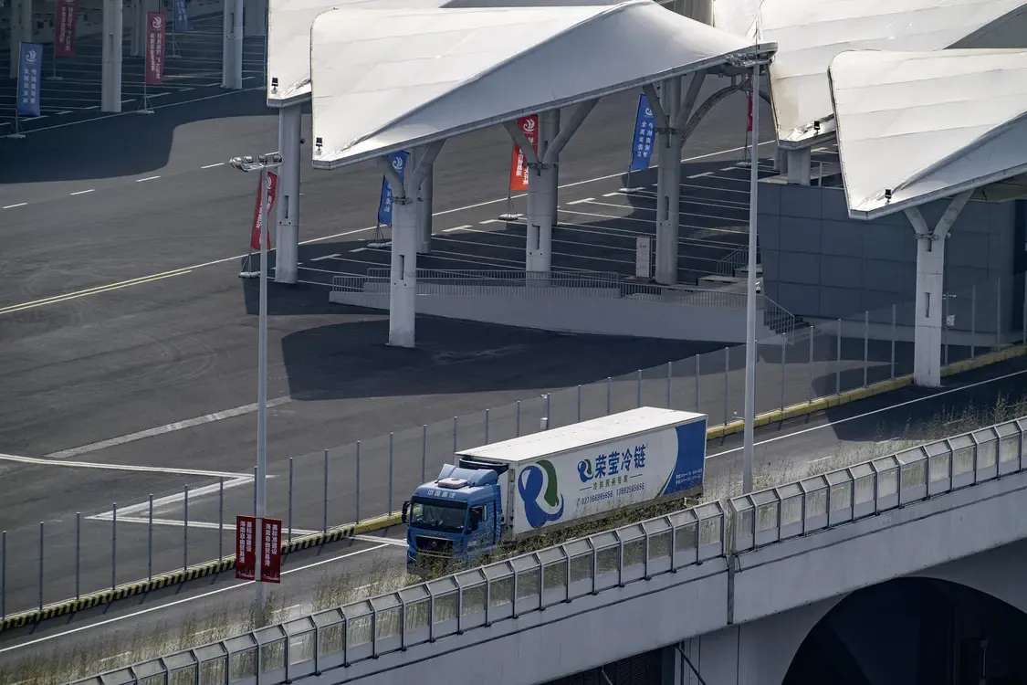 ▲12月18日上午10时开始,海南自贸港“二线口岸”海口新海港、南港离岛货车查验场、海关查验场封关正式启动,第一批通关货物车辆出关 图据视觉中国