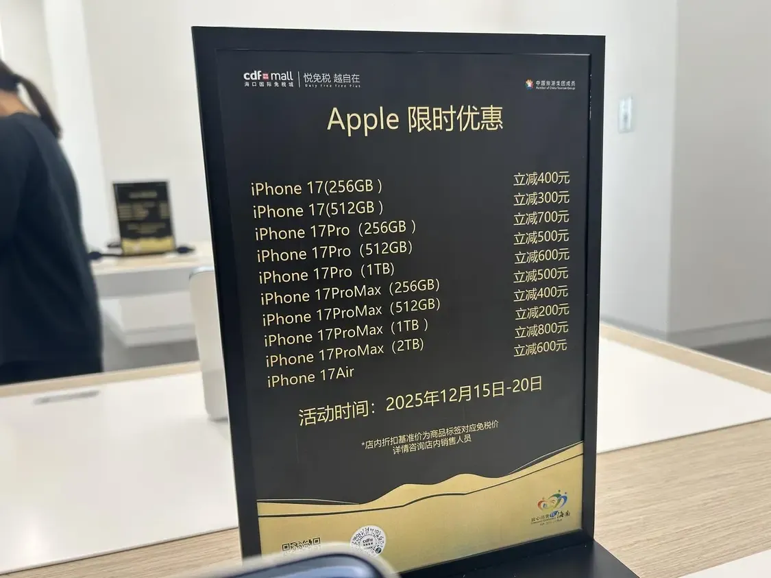 在一楼苹果my studio门店,消费者正选购苹果产品。记者注意到,新款iPhone17 256GB版本免税价为5579元,淘宝官方旗舰店同款售价是5999元,相差420元。iPhone 17 pro优惠更多,免税价8219元,相较官网8999元优惠780元。店员介绍,12月15日至20日,当前在免税价基础上还有立减活动,每款产品立减200元到800元不等。以iPhone 17 pro 256GB版本为例,免税价叠加立减优700元优惠,最终到手价可以低至8030元,比在线上官网旗舰店省去近1000元。