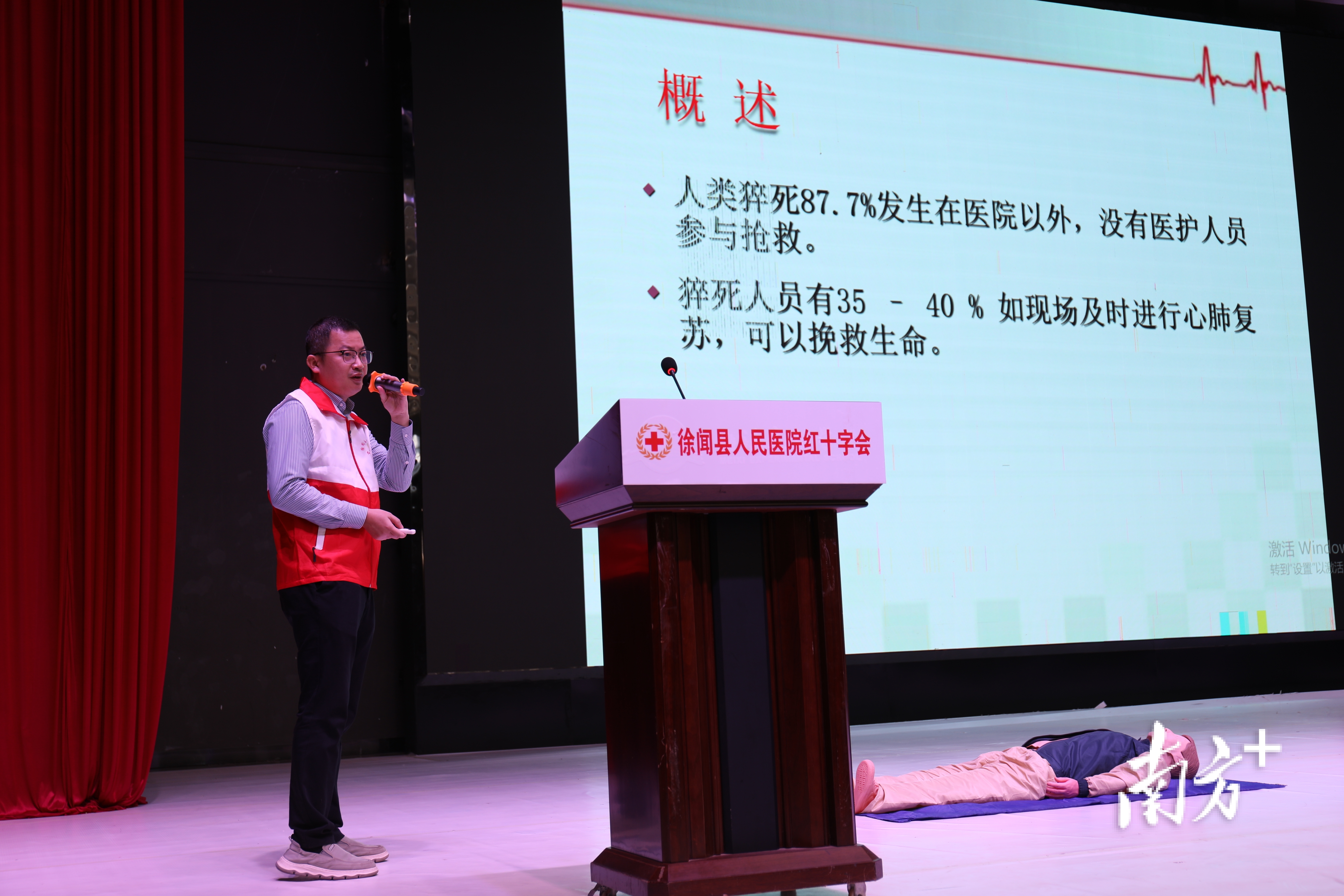 在专家授课与技能培训环节,广东医科大学附属医院徐闻医院呼吸与危重症医学科主任医师李元塔围绕“心肺复苏术及AED应用”作了深入浅出的专业讲解。课程内容紧密结合校园常见突发情况,详细讲解了心肺复苏的按压位置、力度、频率、人工呼吸方法以及AED的操作流程与注意事项。