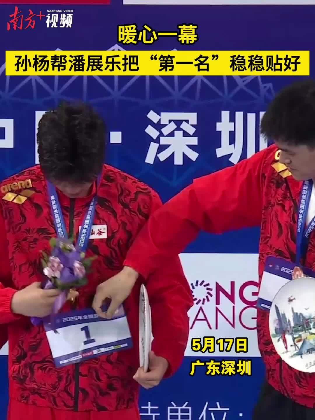 暖心一幕!孙杨帮潘展乐把“第一名”稳稳贴好