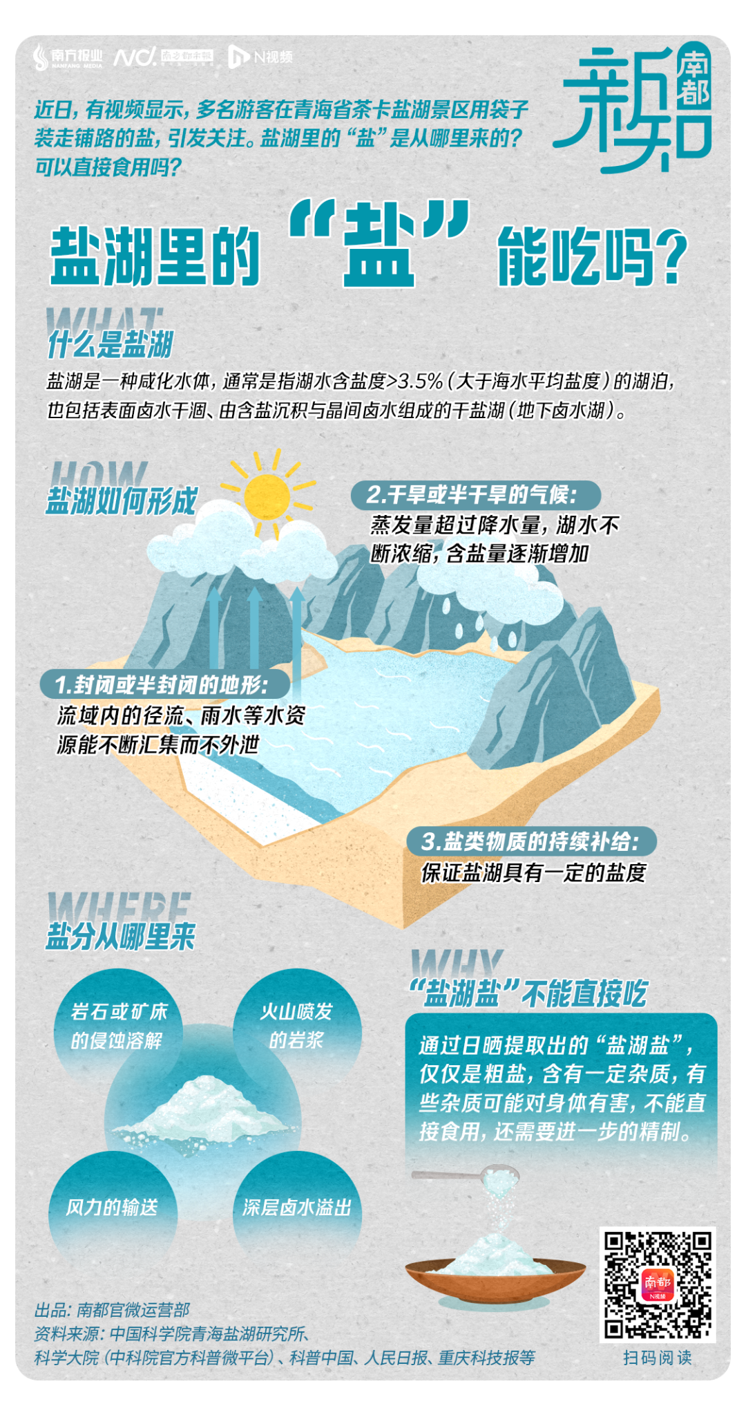 近日,有视频显示,多名游客在青海省茶卡盐湖景区用袋子装走铺路的盐,引发关注。盐湖里的“盐”是从哪里来的?可以直接食用吗?