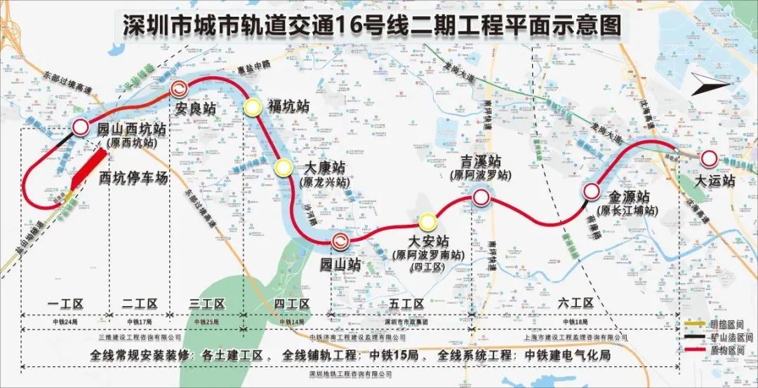 深圳地铁16号线二期共设8站8区间和1个西坑停车场,其中,大安站、大康站、福坑站3站为装配式车站,采用“搭积木”式装配技术施工,整体装配率高达90%。
