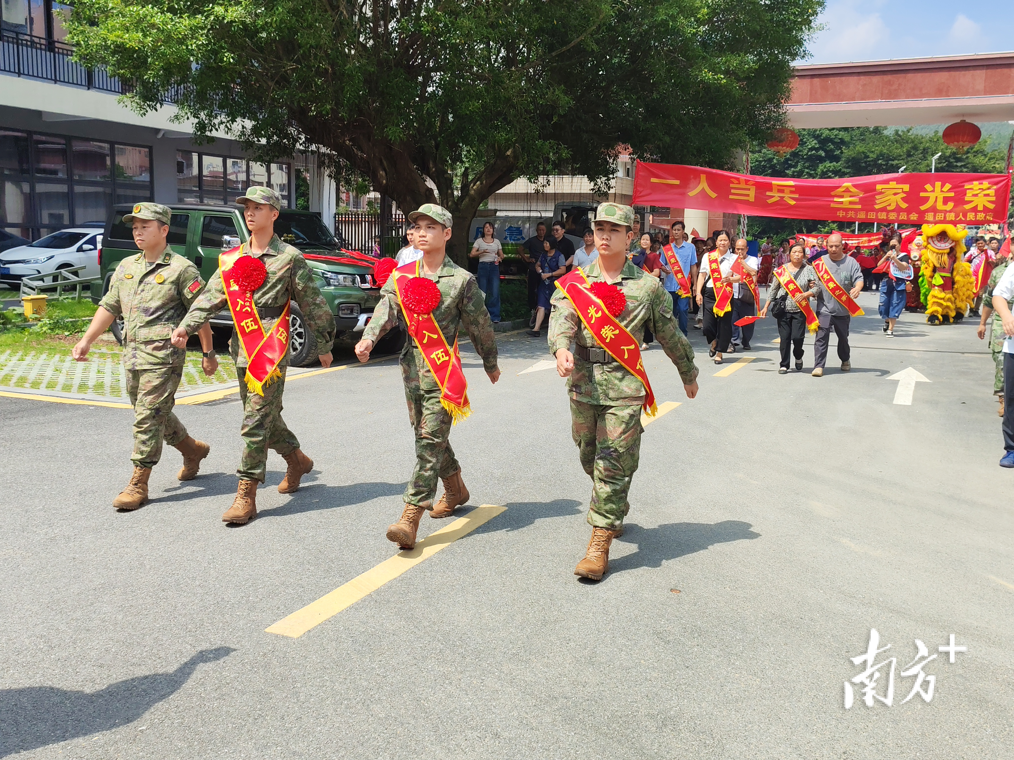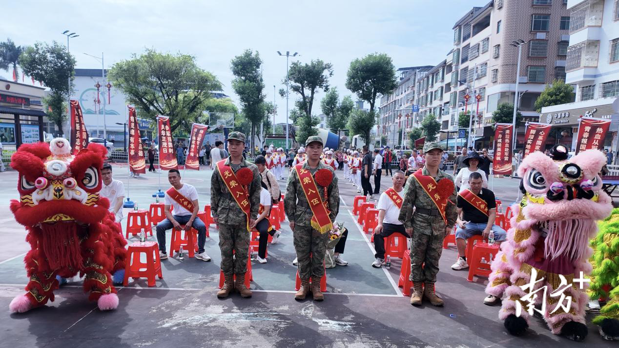 巡游环节中,送兵车队缓缓驶过镇主干道,两旁掌声与鞭炮声此起彼伏,商户和居民纷纷驻足观看,醒狮表演更添喜庆,以传统形式表达对新兵们最真挚的祝福与崇高敬意。