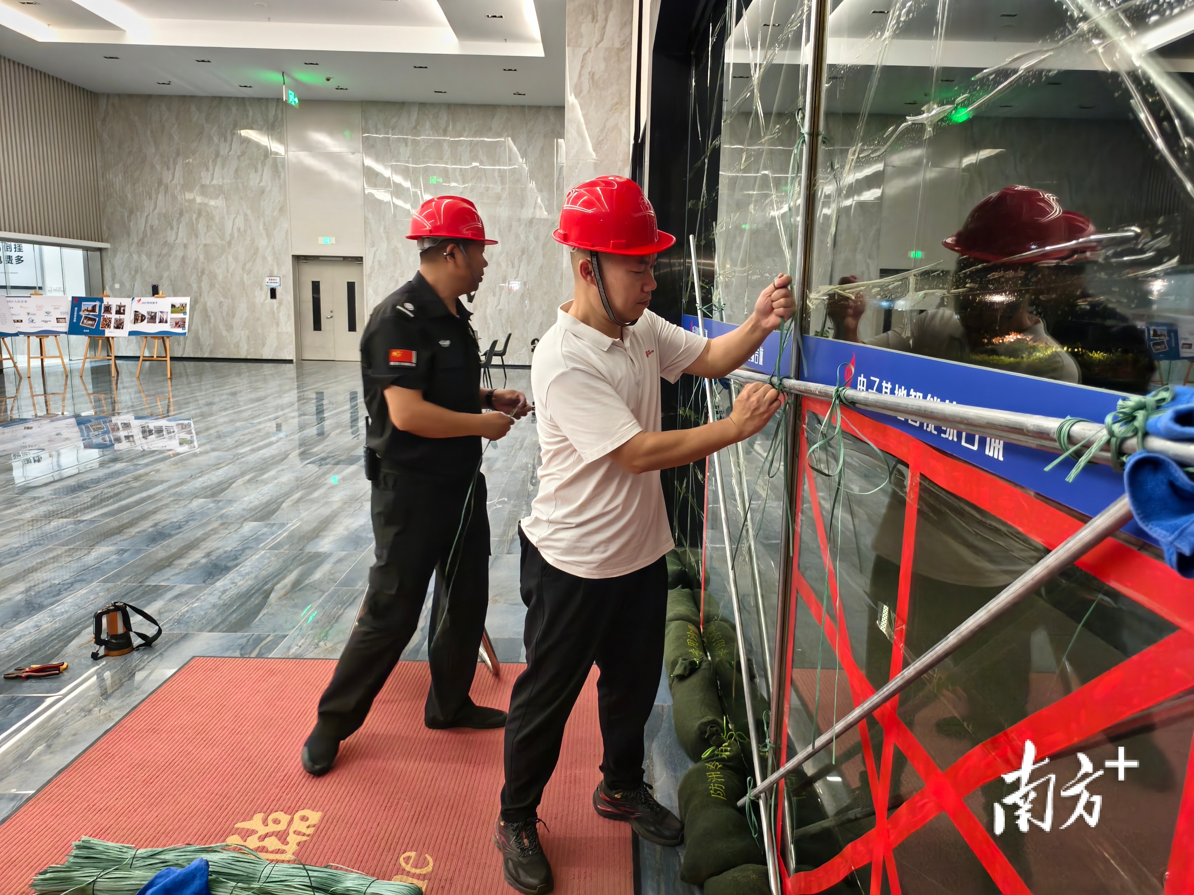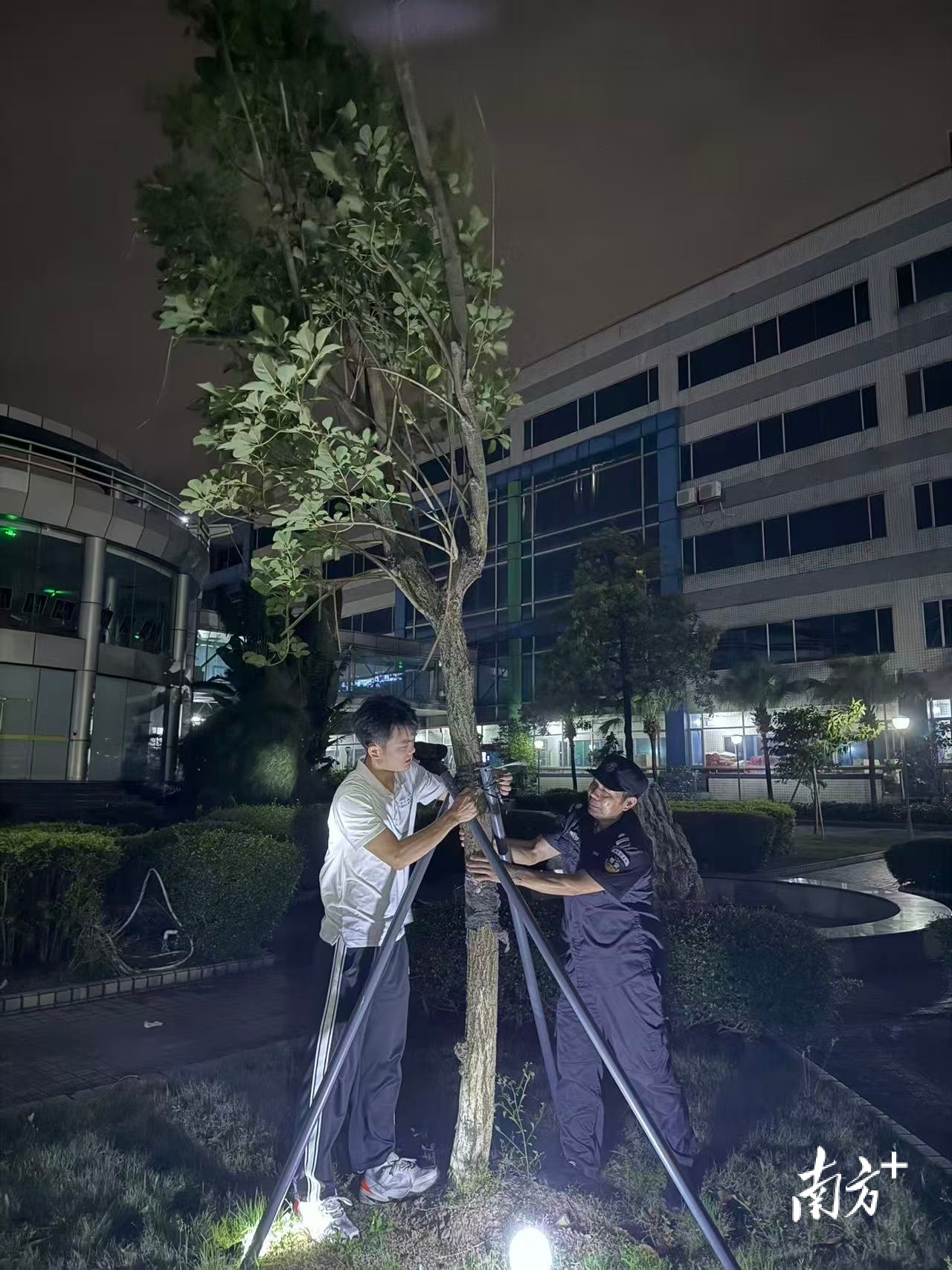 24日凌晨1点47分,台风风力逐渐增强,赵文杰已是第四次组织保安人员进行巡逻。在孵化器喷水池附近,他发现一棵树被台风吹歪,存在倾倒风险,当即组织保安找来竹竿和铁锹,对树木进行支撑加固。在孵化器外围,他发现一段隔离带被风吹至D栋玻璃门,随时可能造成更大损失,便迅速寻找绳索进行固定。