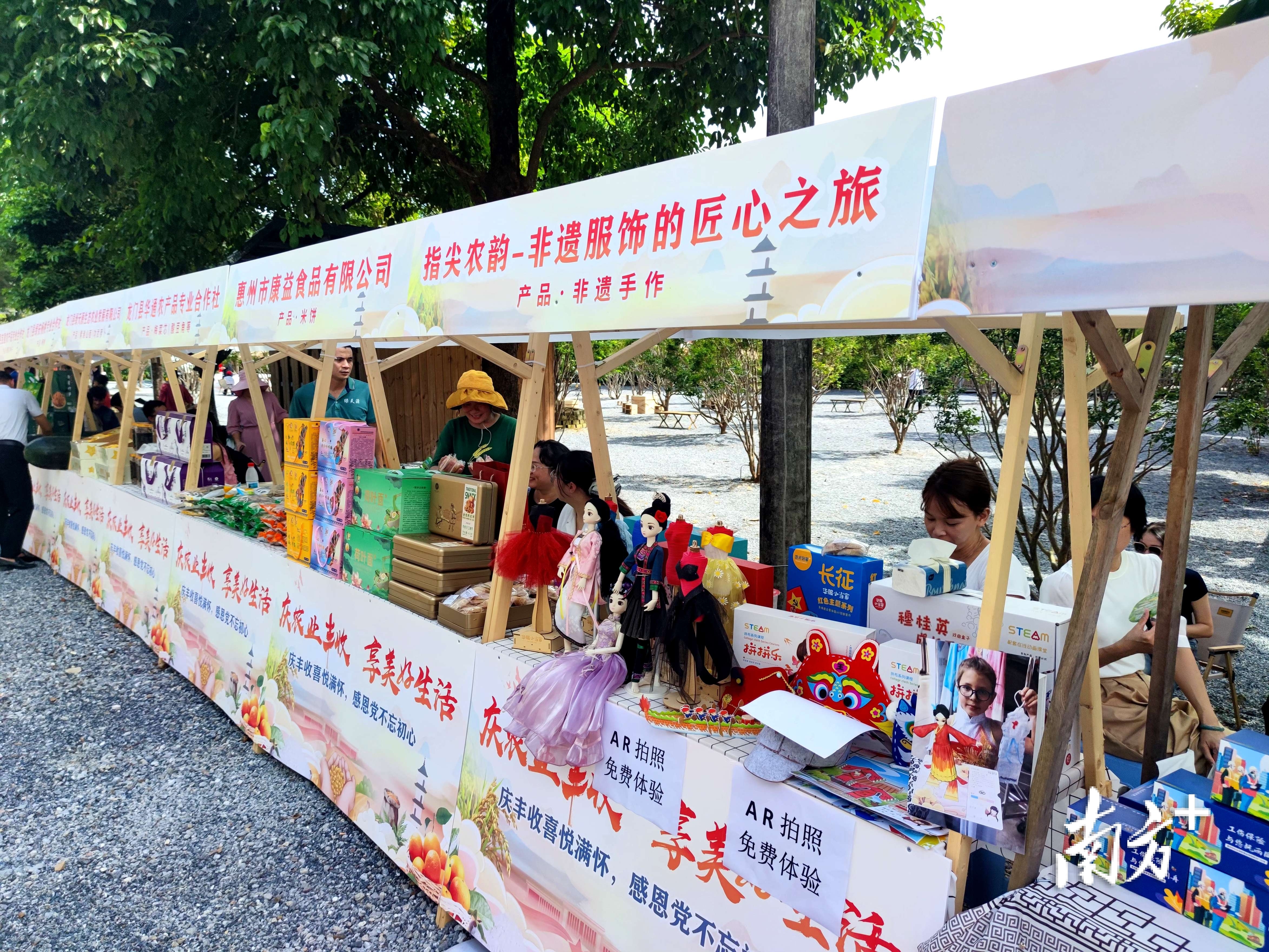 在特色农产品展示区,约50家农业生产经营主体设立摊位。其中,龙门大米、西溪笋、龙门蜂蜜及麻榨杨桃等当地特色农产品纷纷亮相,非遗文创产品也让人眼前一亮。在品鉴区域,龙门米饼、特色山茶等产品引得游客们争相品尝,并获得一致好评。