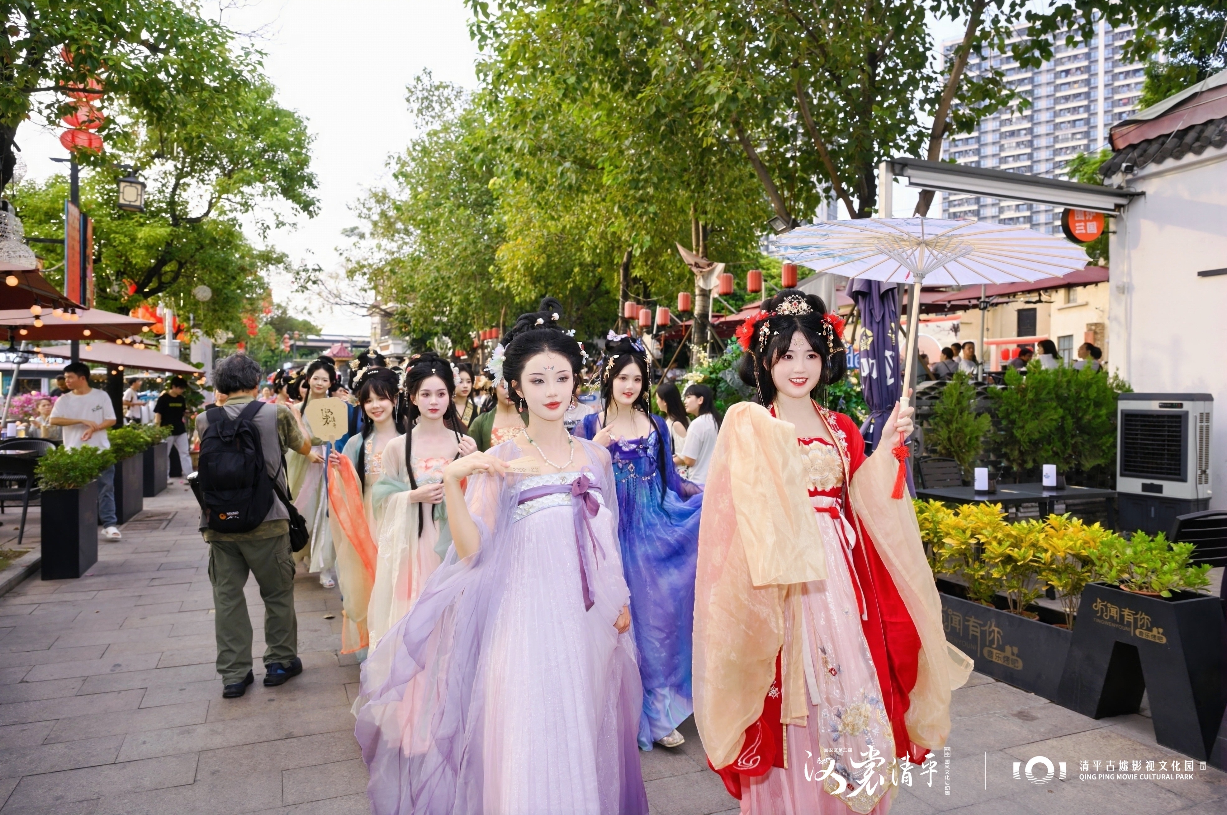 主办方金鼠影业首次打造“清平十二时辰”全时段模式,从晨间古墟开市仪式到夜间市集,全天候展现汉服之美;参与者还可预约汉婚礼仪展示、古风剧本游,亲身“穿越”历史场景。