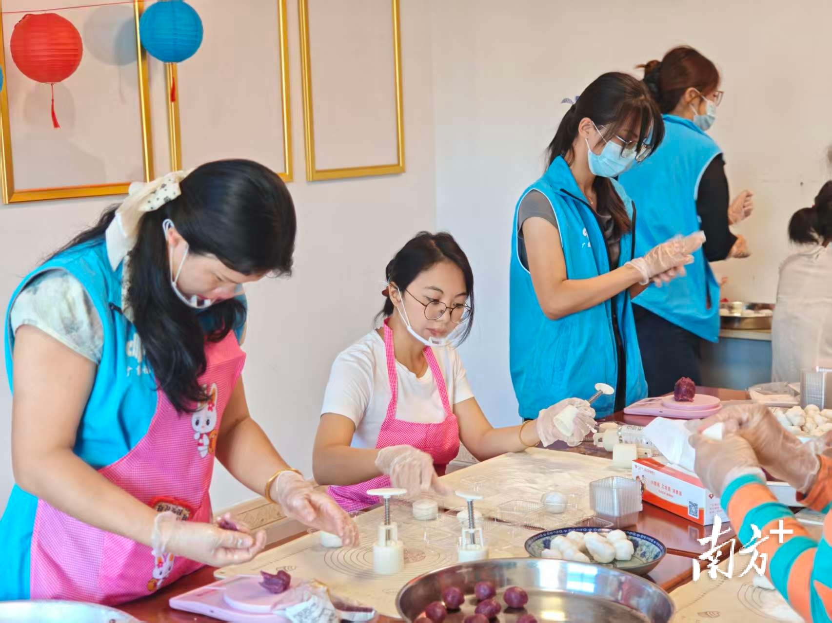在备受欢迎的手工月饼制作环节,社工站精心筹备,提前采购面粉、馅料、月饼模具等材料。社工化身“老师”,示范讲解月饼的制作流程。村民们分组协作,积极参与揉面、包馅、压模等步骤。在互动实践中体验传统文化,增进邻里情感。当一枚枚精致可口的月饼在大家手中诞生时,现场洋溢着成就感和节日的喜悦。