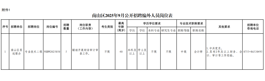 因工作需要,深圳市南山区2025年9月公开招聘编外人员5名,具体岗位参见《南山区2025年9月公开招聘编外人员岗位表》(附件1),现就有关事项公告如下: