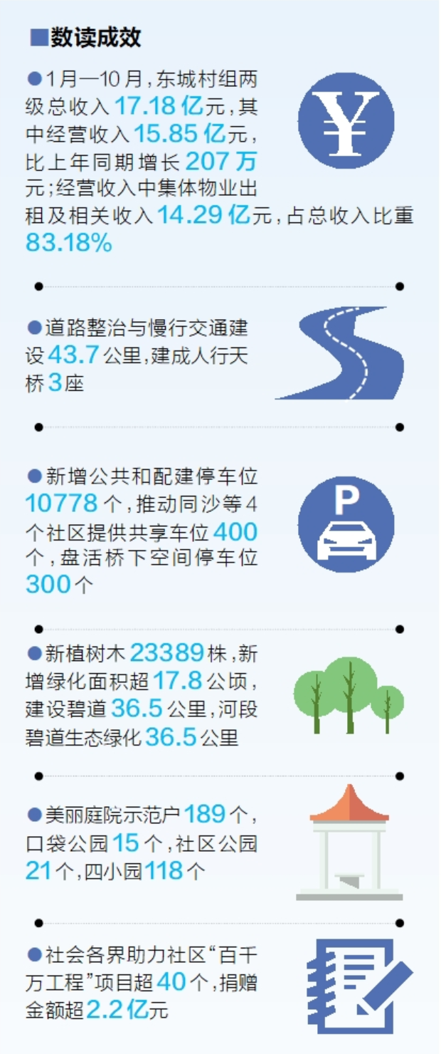 “沉睡资产”转为“增收活水”的实践,正是东城推动集体经济“登高阶”的缩影。今年1月至10月,街道村组两级总收入突破17亿元。随着城市更新项目的深入推进,火炼树、桑园、立新等社区集体净资产预期将超10亿元,真正鼓起了群众的“钱袋子”,促进集体经济向“空间集约、产业高端”转型。