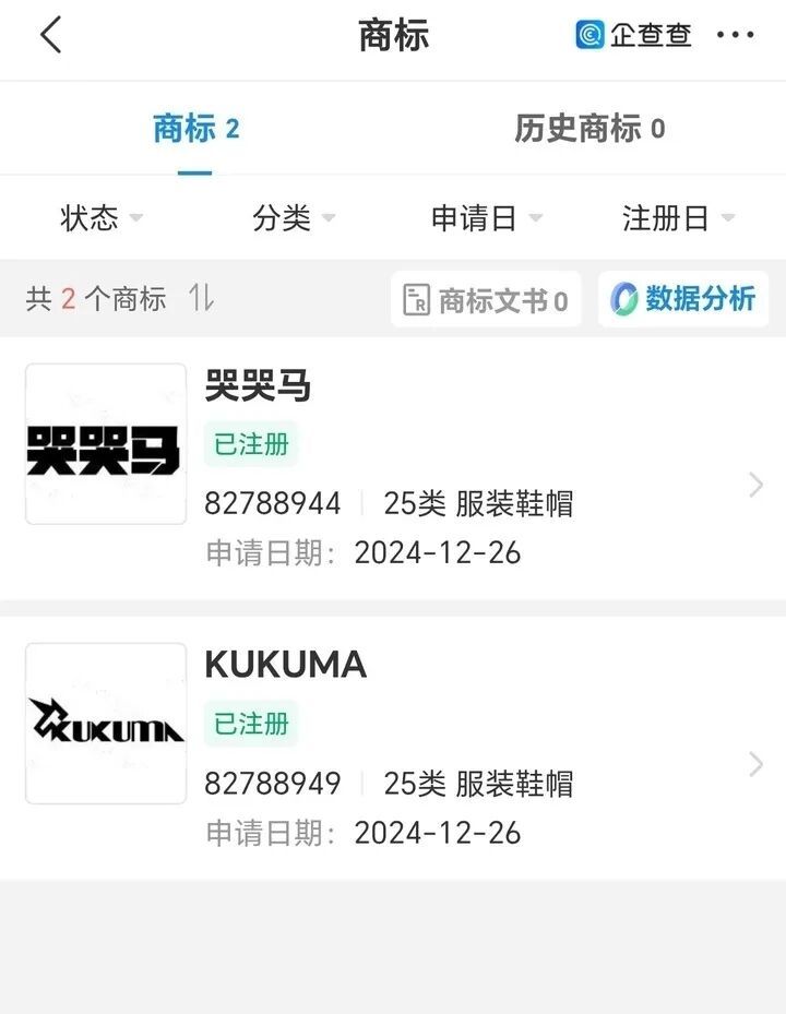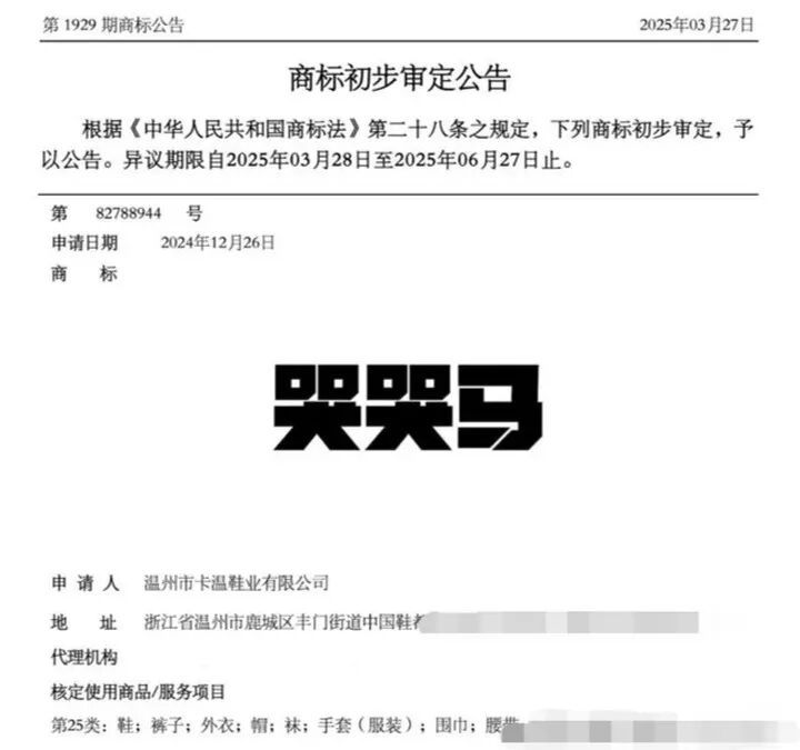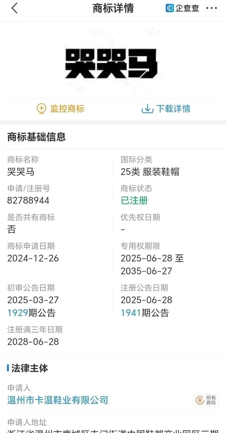 记者通过企查查平台查询发现,温州市卡温鞋业有限公司注册的商标类型为第25类“服装鞋帽”,专用权限从2025年6月28日持续到2035年6月27日。据了解,商标保护遵循“按类别确权”的原则,不同品类的商标互不冲突。只要义乌“哭哭马”厂家申请玩具商标,3个月后即可初审公告。