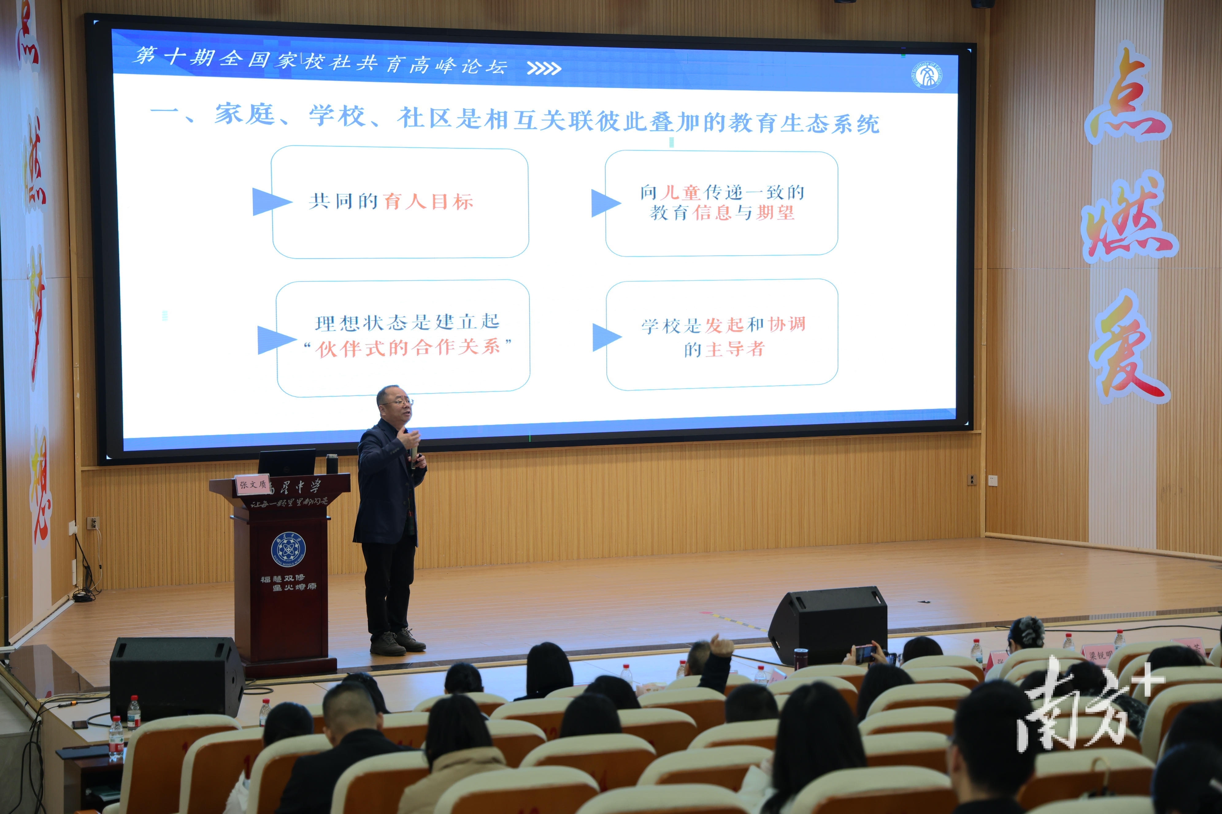 当天下午举行了“家校(园)社共育之‘大家说’”主题发言环节,深圳市光明区“苗圃工程”名园长陈晓带来的《小手创造大世界——用劳动教育搭建家园共育的桥梁》主题分享,阐述了劳动教育如何为家园共育搭建坚实桥梁;华南师范大学硕士研究生校外导师张亚康带来《搭建家校社 “三位一体”读写生态圈》主题发言,分享“三位一体”的读写生态圈为家校社共育提供了创新思路;张文质家庭教育指导师、东莞松山湖北区学校教师陈启华分享了《从 “被动配合” 到 “主动创造”:解锁家委会的自组织潜能》主题发言。
