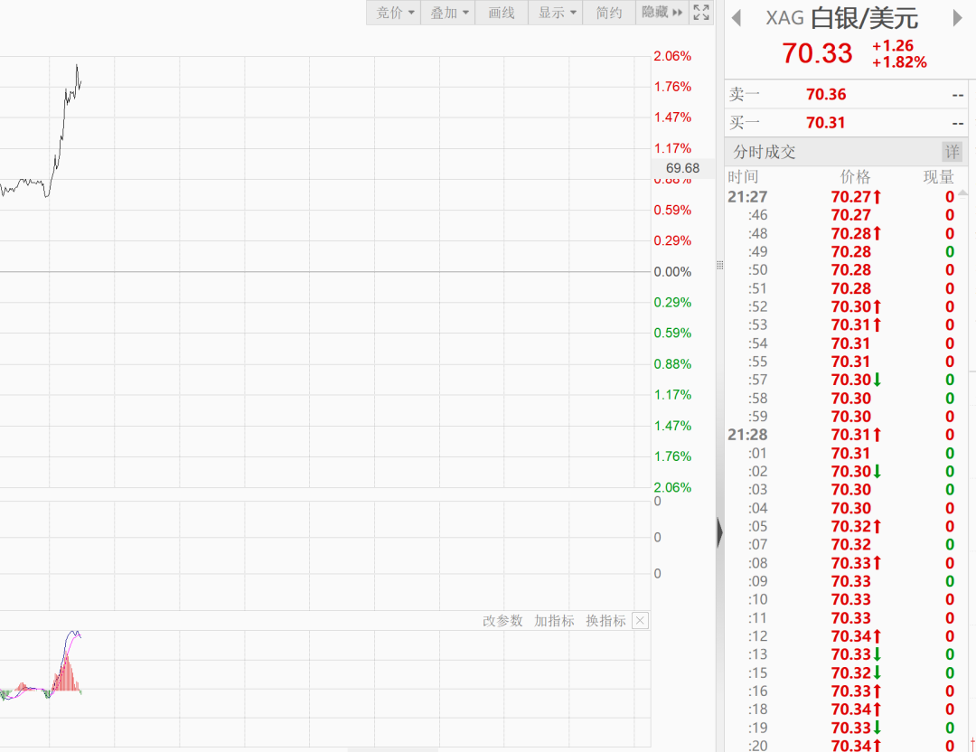 截至今日晚间发稿,现货白银向上触及70美元/盎司,为历史首次,日内上涨1.82%。