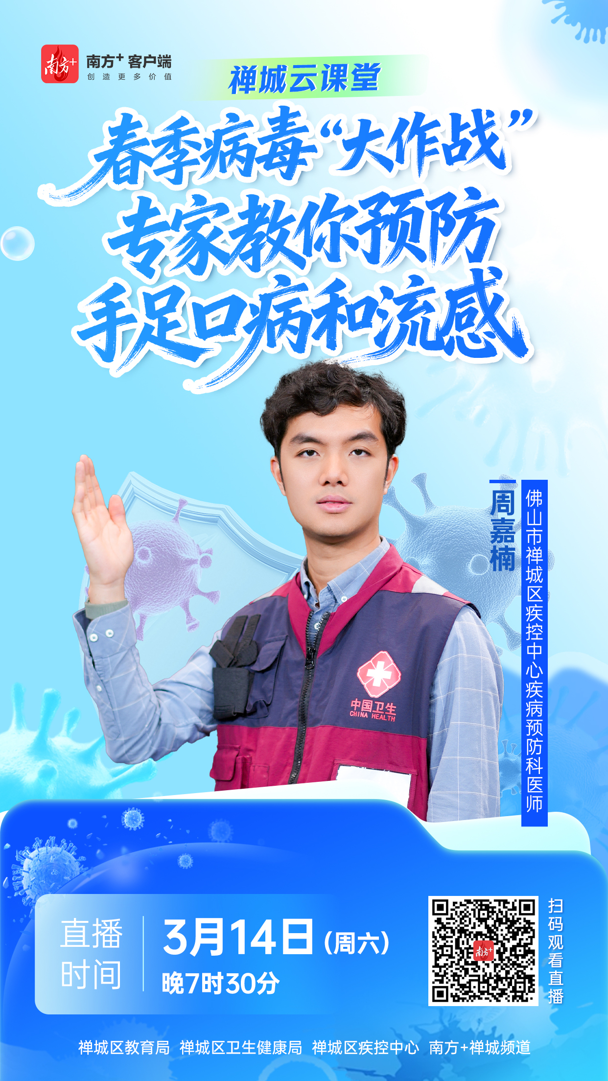 3月14日,禅城区教育局、禅城区卫生健康局、禅城区疾控中心联合南方+禅城频道,将特别推出“禅城区春季疾病防控云课堂”。本次云课堂特邀疾控专家在线开讲,围绕手足口、流感等春季高发疾病,划重点、拆难点,手把手教学生、家长和学校做好科学防护,共同筑牢校园健康防线。