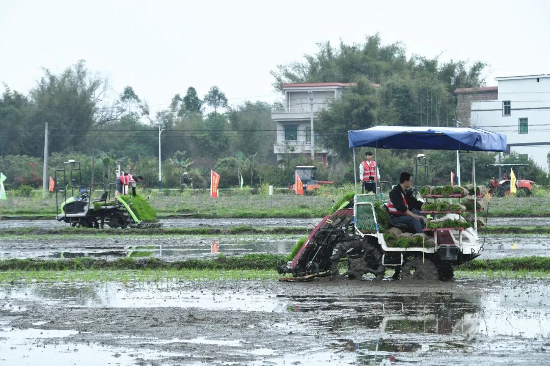 在大岗镇,水田与旱地交织的耕作景象。田野上农机轰鸣,热闹非凡。华地村的田间地头,连片紫云英长势喜人,旋耕机、插秧机等各式农机来回作业,一派翻地、插秧的春耕繁忙景象。