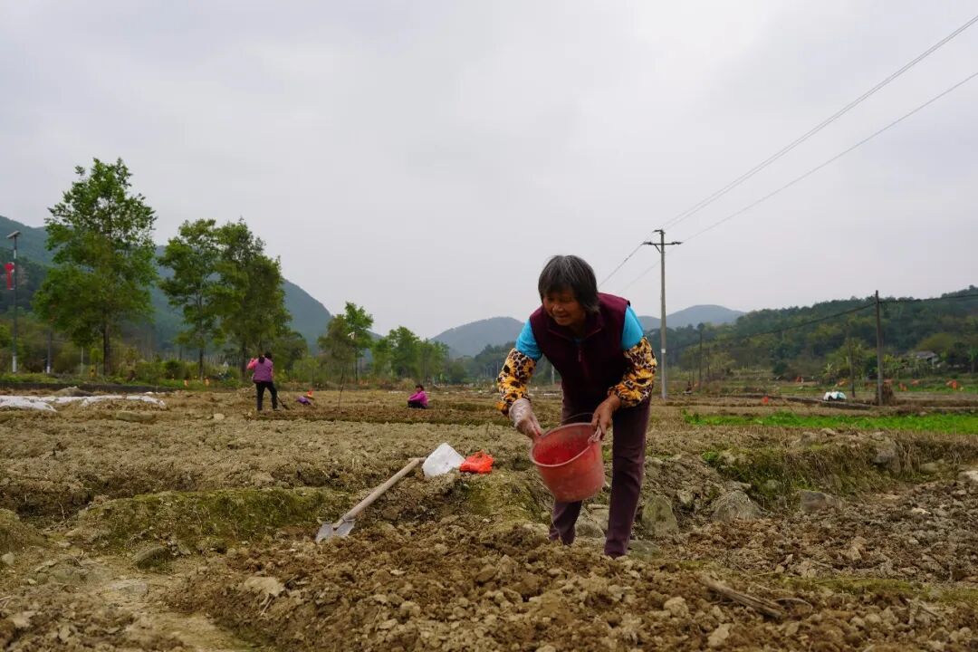 在凤真村的山坡田地,农妇谢阿姨弯着腰,手持小铁锹刨坑点籽,随后覆土压实,种下希望。
