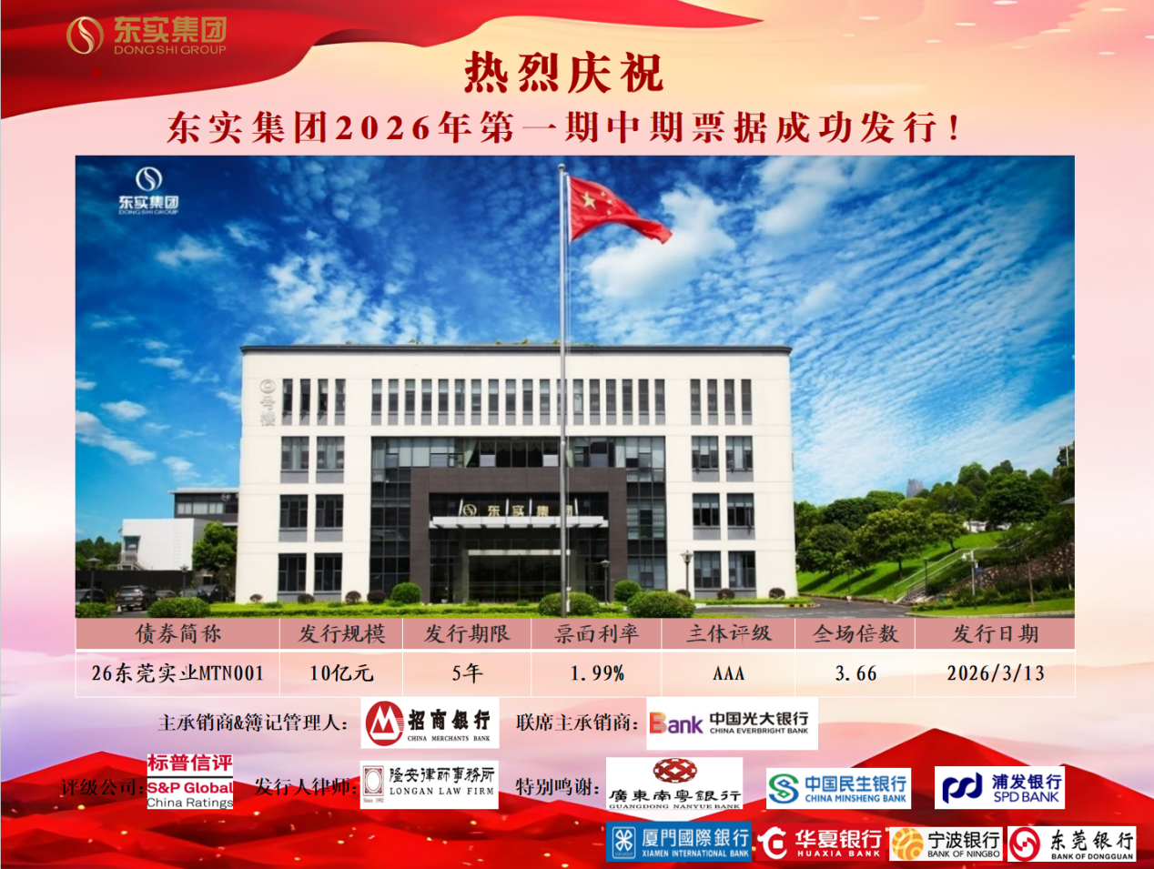 3月13日,东莞实业投资控股集团有限公司成功发行2026年第一期中期票据。本期发行规模10亿元,期限5年,票面利率低至1.99%,创下集团中长期债券发行利率历史新低。详情→