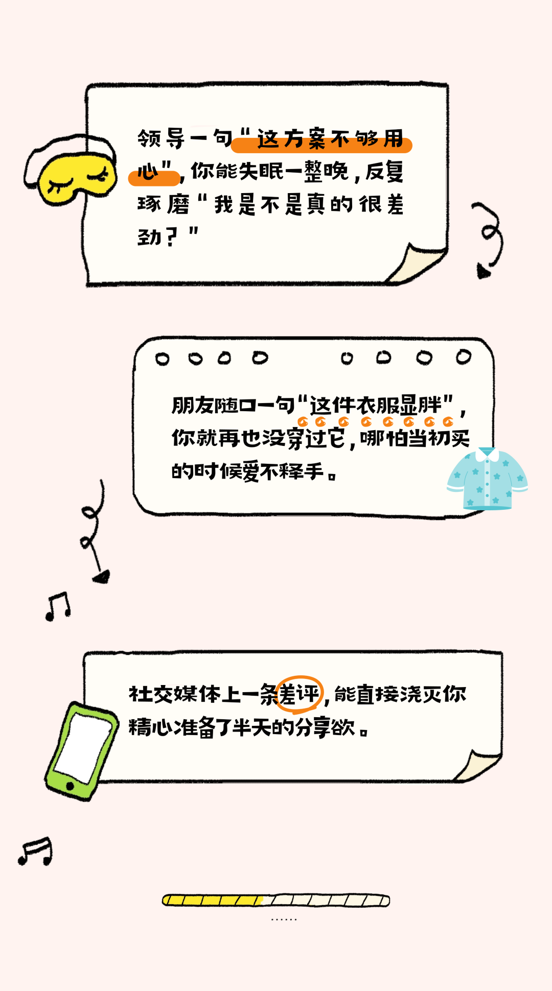 这种本能一直延续到现在。导致我们一听到不好的评价,大脑立刻拉响警报,焦虑、委屈、愤怒瞬间涌上来。而且你会忍不住反复琢磨:“他为什么这么说我?”“我是不是真的有问题?”越想越深,最后让这个坏评价的影响越来越大。