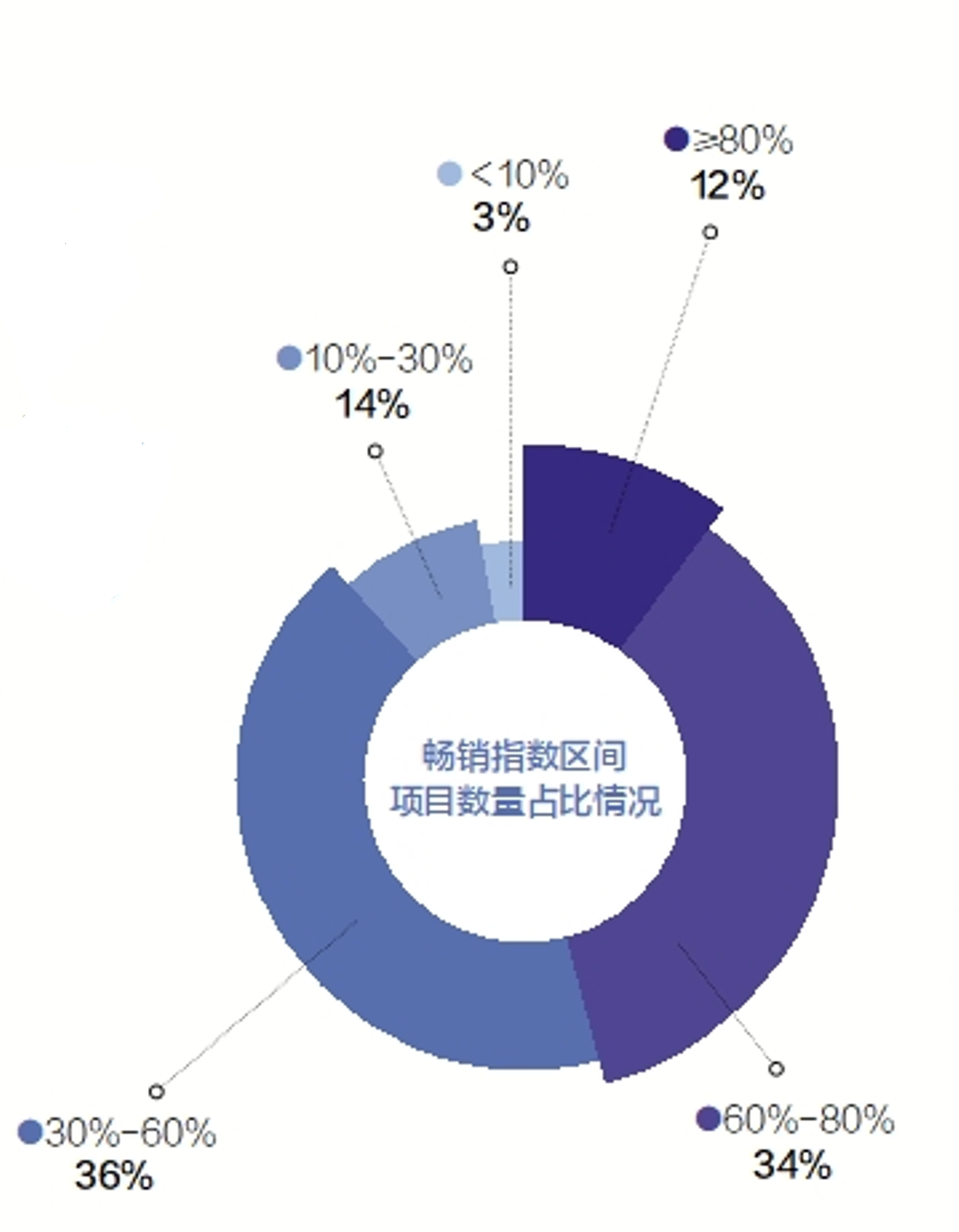 而畅销指数低于80%的项目多达51个,占比88%。其中,指数在60%—80%之间的项目20个,占比34.5%;30%—60%的项目21个,占比36.2%;低于30%的项目10个,占比17.2%。