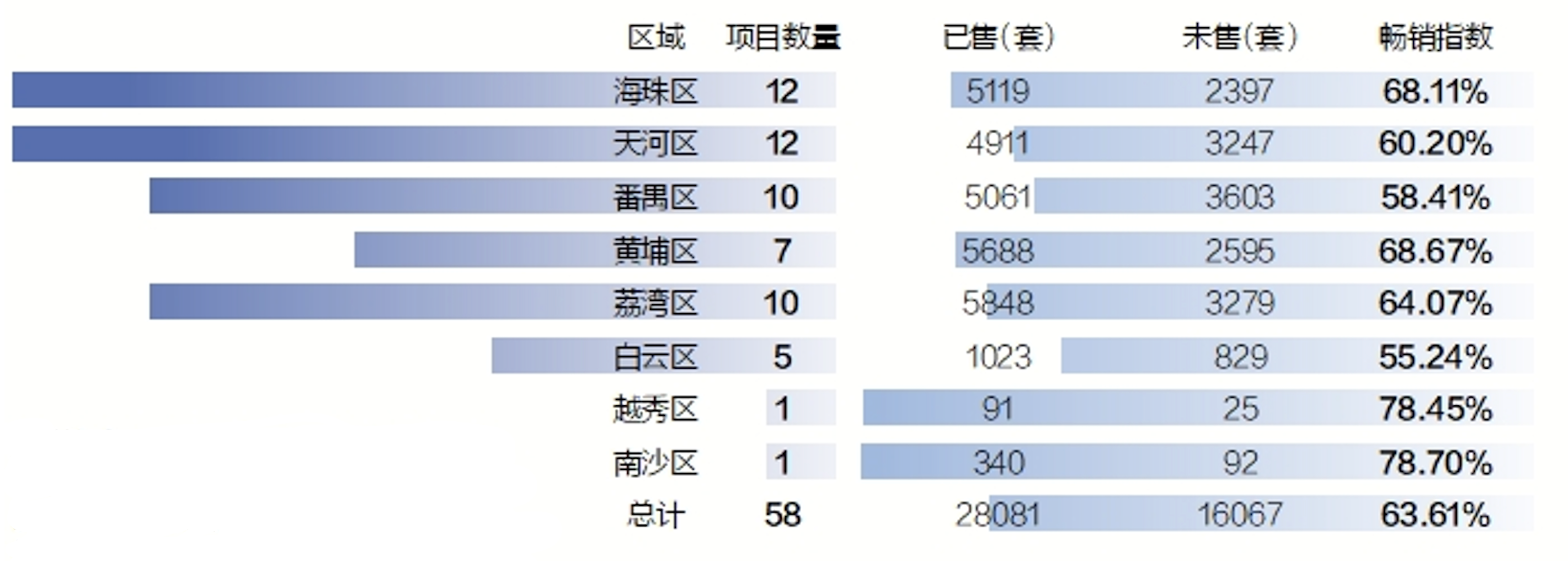 拥有太古里+万象城双重高端商业规划的荔湾区也表现不俗,10个项目已售5848套,未售3279套,平均畅销指数0.6407。其中,保利珠江印象、保利臻誉等项目的去化率位居前列。