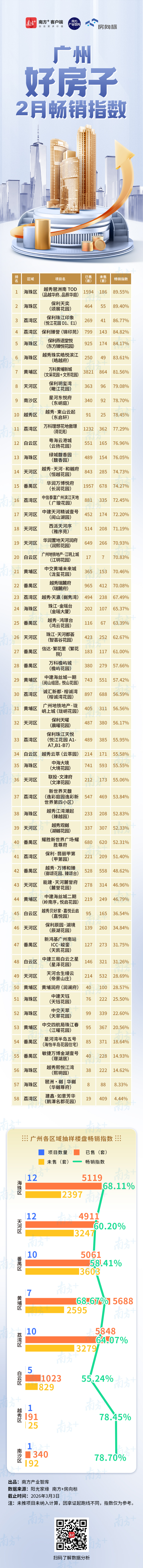 推土机的轰鸣声在珠江新城马场地块响起,广州楼市在这个早春以一种热闹的姿态,拉开了新一年的序幕。2月25日,马场地块在8家企业历时9小时、243轮激战之下,以236亿元落槌;3月2日,SKP华南首店正式签约。当城市的目光被这场“开年大戏”吸引时,广州楼市的真实“水温”如何?南方产业智库最新发布的“2026年2月广州好房子畅销指数”显示,截至3月3日,全市58个重点在售楼盘累计未售房源达16067套,平均去化率约64%。在春节超长假期的扰动下,市场整体成交季节性回落,但随着节后土拍市场的热闹,看房人数上涨近四成,这1.6万套库存能否得到市场认可?