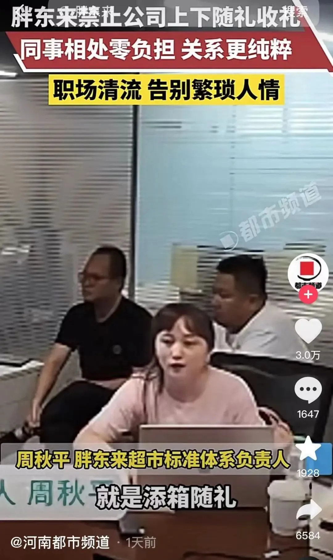9月24日,“胖东来禁止公司上下随礼”冲上微博热搜第一。据报道,近期在联商网组织的一次国内零售企业内部人力资源沟通会上,胖东来代表介绍了公司的一项文化制度,即员工家有红白大事时,不允许同事间“添箱随礼”,该公司相关部门会向有家事的员工发放贺金或慰问金。记者随后向胖东来公司进行求证,后者确认属实。