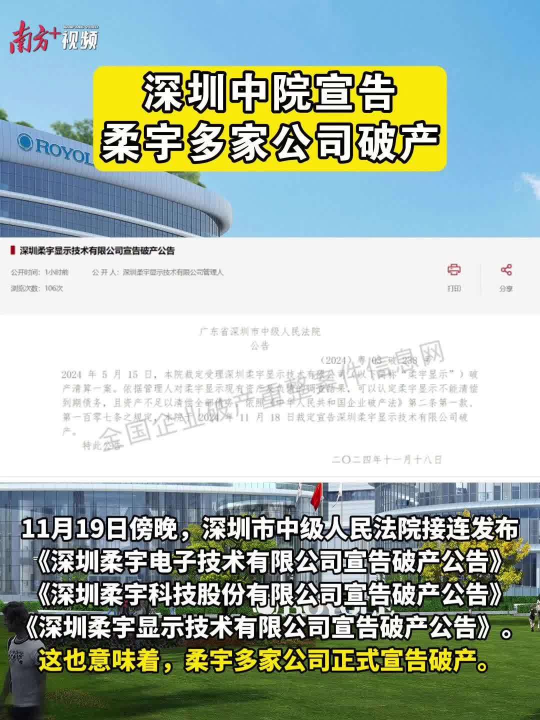 据深圳市中级人民法院公告,依据调查结果,可以认定柔宇不能清偿到期债务,且资产不足以清偿全部债务。本院于2024年11月18日裁定宣告深圳柔宇显示技术有限公司破产。详情>>