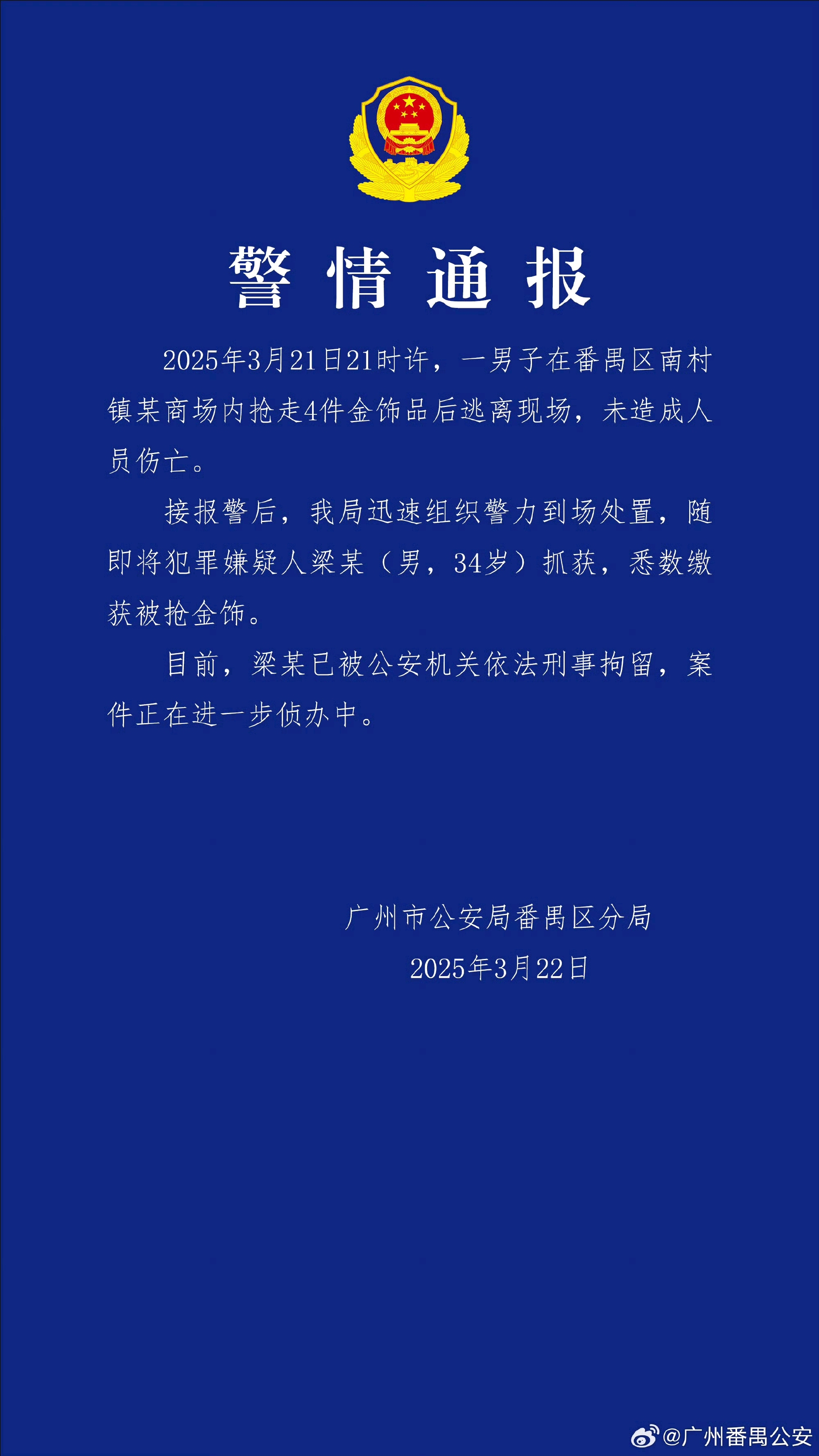 3月22日,广州市公安局番禺分局发布警情通报称:2025年3月21日21时许,一男子在番禺区南村镇某商场内抢走4件金饰品后逃离现场,未造成人员伤亡。