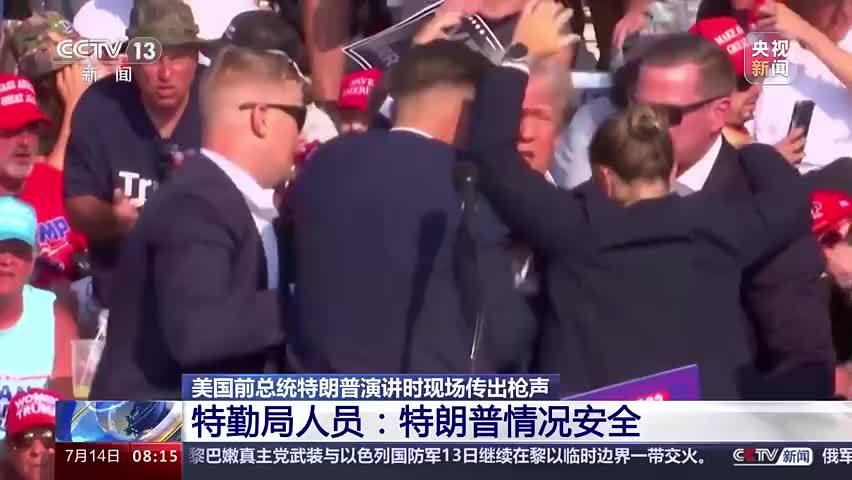 直播画面显示,特朗普右耳及面部有血迹。美国特勤局人员向媒体证实,特朗普情况安全。