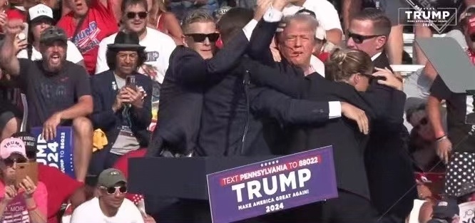 当地时间13日下午,特朗普在美国宾夕法尼亚州举行竞选集会发表演讲时,现场响起枪声。他在特勤人员保护下立即撤离了演讲台。(解读>>特朗普遇刺,对美国大选有何影响?)
