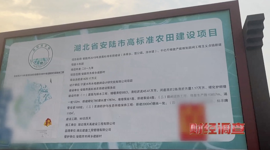 工作人员的说法和村民们反映的情况大相径庭,真实的情况又究竟是什么呢?就在距离这片光伏阵列仅一路之隔的地方,记者看见了一块湖北省安陆市高标准农田建设项目公告牌。