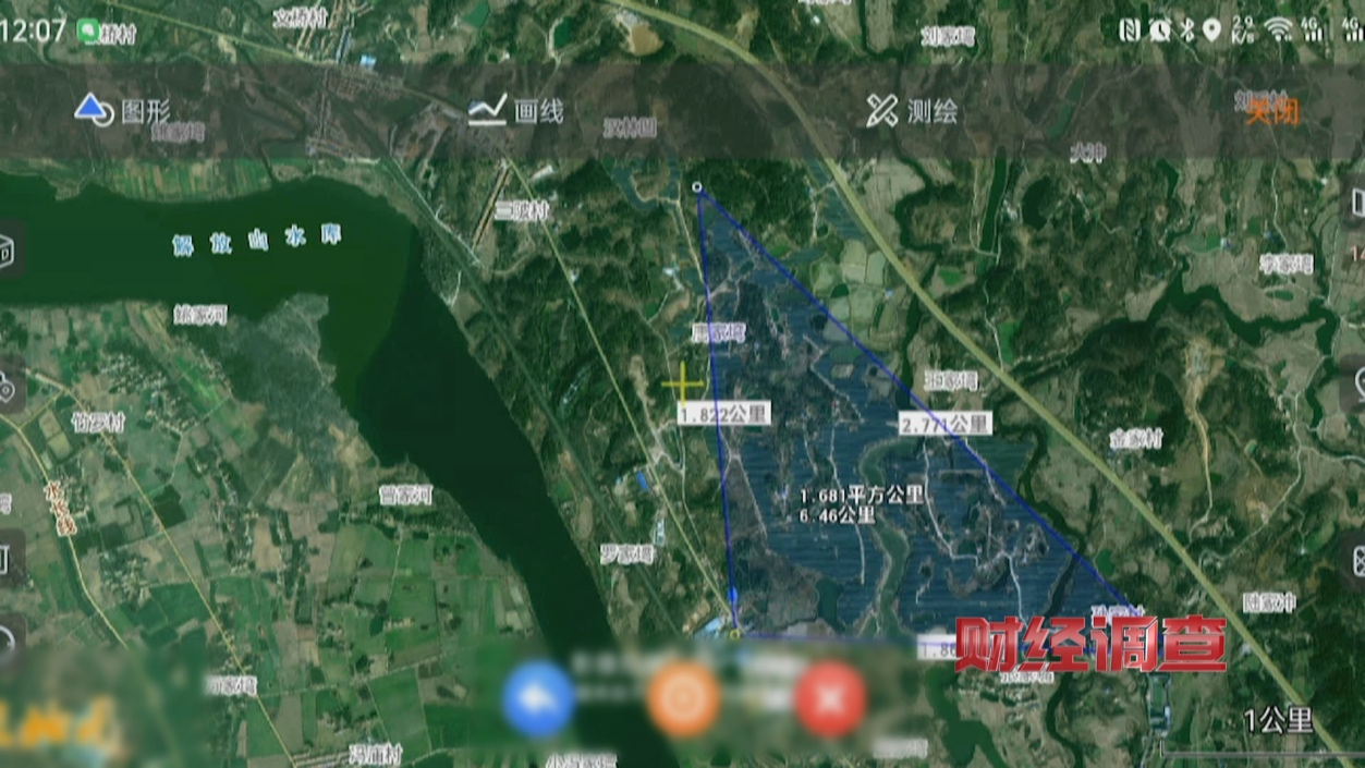 除了木梓乡,记者还在安陆市其他地方发现了占用基本农田甚至高标准农田建设光伏电站的情况。在安陆市洑水镇,同样有大面积连片光伏项目。根据卫星地图显示,这里连片光伏近似直角三角形布局,三角形的两条直角边近2公里长。