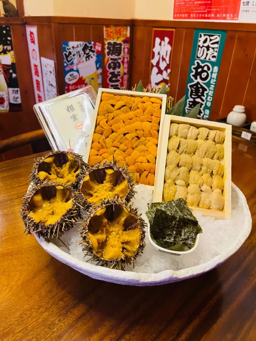 后左侧是北海道高级木盒海胆,后右侧是大连产的木盒海胆,前面是大连鲜活海胆。