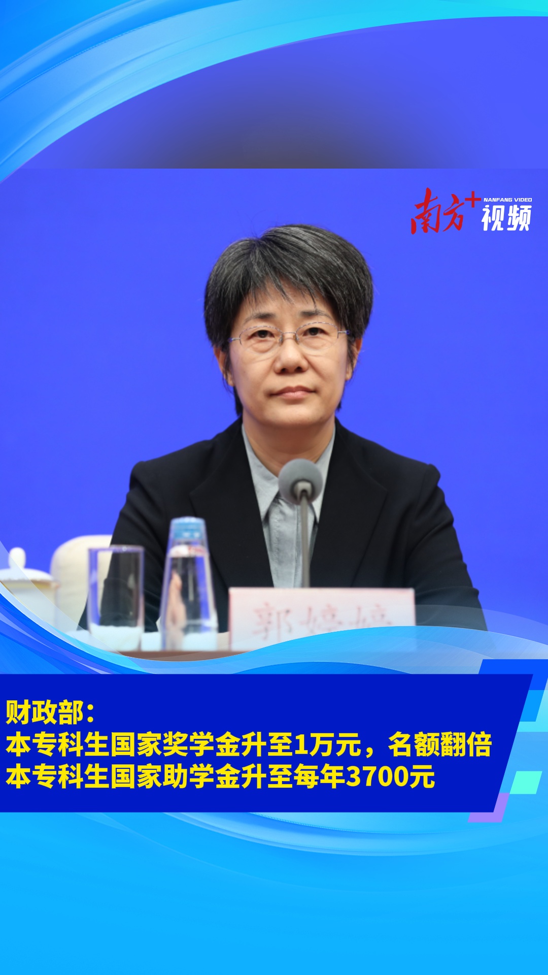 财政部: 本专科生国家奖学金升至1万元,名额翻倍,本专科生国家助学金升至每年3700元