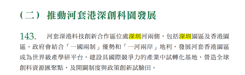 施政报告对“河套深港科技创新合作区”着墨较多。