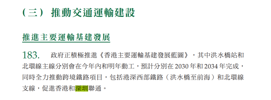 在交通方面,香港特区政府正积极推进《香港主要运输基建发展蓝图》,其中洪水桥站和北环线主线分别会在今年内和明年动工,预计分别在2030年和2034年完成,同时全力推动跨境铁路项目,包括港深西部铁路(洪水桥至前海)和北环线支线,促进香港和深圳联通。