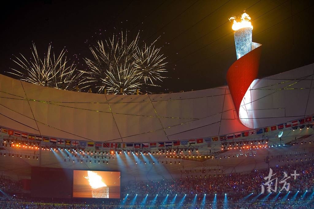 随后,李宁来到火炬塔旁,点燃引线,巨大的火炬顿时燃起喷薄的火焰,熊熊燃烧的奥林匹克圣火把鸟巢上空映照得一片辉煌。绚丽的焰火腾空而起,同一时间,北京各地4万余发焰火齐放与国家体育场上空的焰火遥相呼应。奔放的音乐、热烈的欢呼震耳欲聋,现场气氛达到了高潮。这是中国人民永远难以忘怀的时刻,也是现代奥林匹克运动又一辉煌的瞬间。