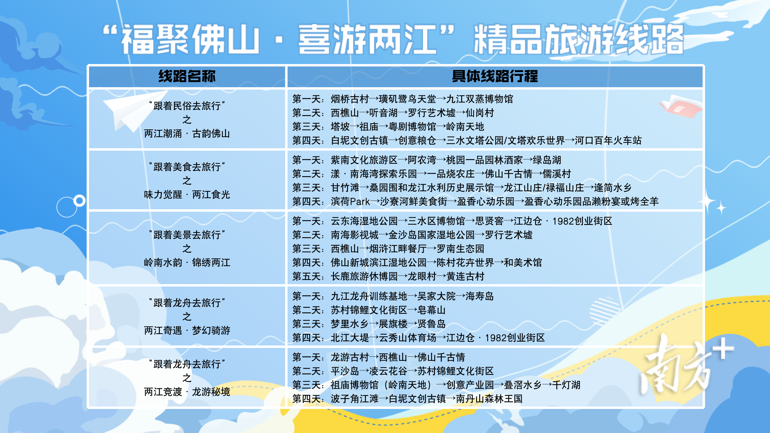 当天的另一大亮点就是佛山“环两江”文旅推介片正式发布。视频中主要介绍了100多场活动涵盖民俗、节庆、美食、赛事、演艺等方面,并与沿江景点、景观、街区、场馆等串联起来,以“开福运——跟着民俗去旅行之宝藏两江”“满口福——跟着美食去旅行之寻味两江”“饱眼福——跟着美景去旅行之锦绣两江”“享耳福——跟着音乐去旅行之乐韵两江”“超幸福——跟着龙舟去旅行之龙游两江”“超幸福——跟着赛事去旅行之活力两江”系列主题予以呈现,以串珠成链的方式展示了“环两江”先行区深厚的文化底蕴和丰富的旅游资源,吸引更多游客前来佛山打卡旅游。