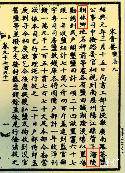 至宋代,“海陵”二字被正式出现在官方记载中,《宋会要辑稿》有载:“绍兴元年三月十五日,尚书工部言:提举广南路茶盐公事司申:检踏委官相视到南恩州阳江县管下海陵朝林乡地名神前等处,各有盐田,咸潮阴浸,堪以置场,劝诱到民户开垦盐田计一顷二十四亩,置灶六十七眼,一年收盐总计七十万八千四百斤。”