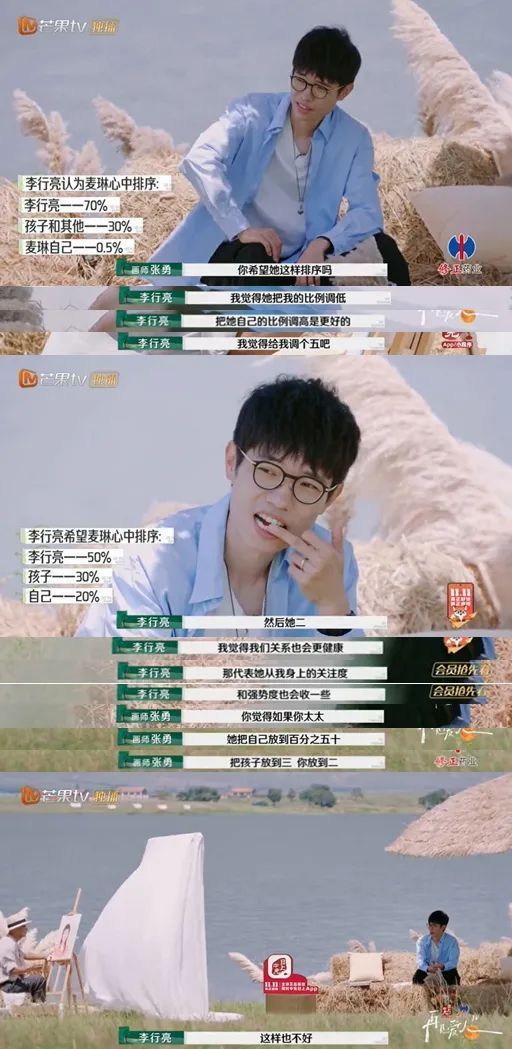 有一集湖边画像,李行亮告诉画师,他希望在麦琳的关注里,他占据50%、孩子占据30%、麦琳自己20%。画师问:如果换一下,他只占20%,让麦琳自己占据50%呢?李回答:“那这样也不好。”