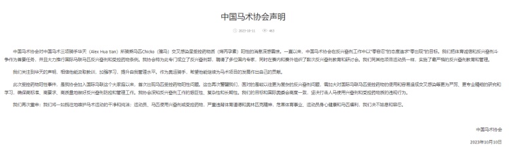 10月10日,中国马术协会官方发布了中国马术运动员华天的一则声明,由于他的马匹在比赛中被发现体内含有管控药物(非兴奋剂违禁类),2024年巴黎奥运会团体资格因此被取消。