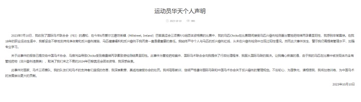 华天在声明中对事件进行了简要说明。2023年7月10日,华天收到了国际马术联合会(FEI)的通知,在今年6月爱尔兰磨坊街镇(Millstreet, Ireland)巴黎奥运会三项赛F/G组团体资格赛的比赛中,马匹Chicko在比赛期间接受马匹兴奋剂检测查出管控药物烯丙孕素呈阳性。