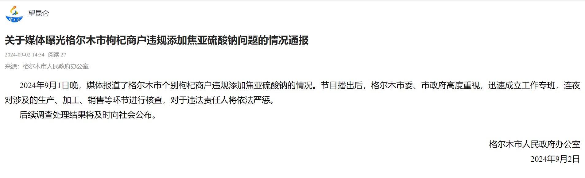 9月2日,青海格尔木市人民政府办公室通报,9月1日晚,媒体报道了格尔木市个别枸杞商户违规添加焦亚硫酸钠的情况。节目播出后,格尔木市委、市政府高度重视,迅速成立工作专班,连夜对涉及的生产、加工、销售等环节进行核查,对于违法责任人将依法严惩。后续调查处理结果将及时向社会公布。 编辑 傅倩影 订阅后可查看全文(剩余80%)