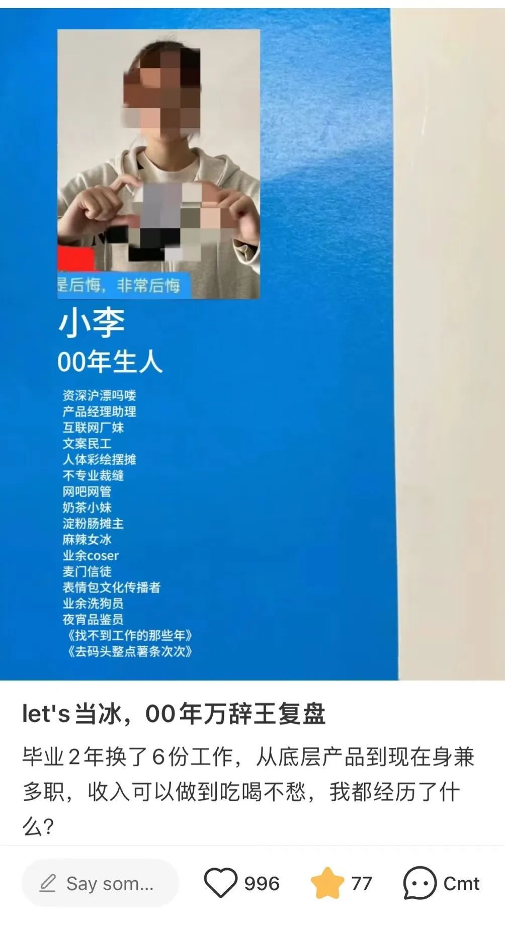 00后打工人泽希是名副其实的“万辞王”。她在社交媒体上声称,毕业至今三年,已经换了20多份工作,有的工作甚至干不到一周。说到自己辞职的原因,她直言:“老板找事儿,辞;干得不开心,辞;能力低下达不到要求,辞。”