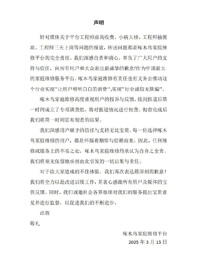 啄木鸟家庭维修官方微博道歉,称已成立专项调查组,将对报道情况进行彻查。彻查完成后,第一时间宣布彻查结果。