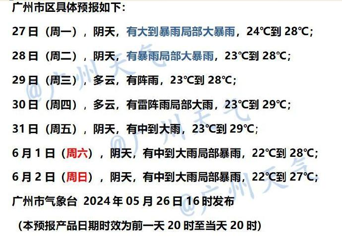 27日(周一),阴天,有大到暴雨局部大暴雨,24°C到28℃;