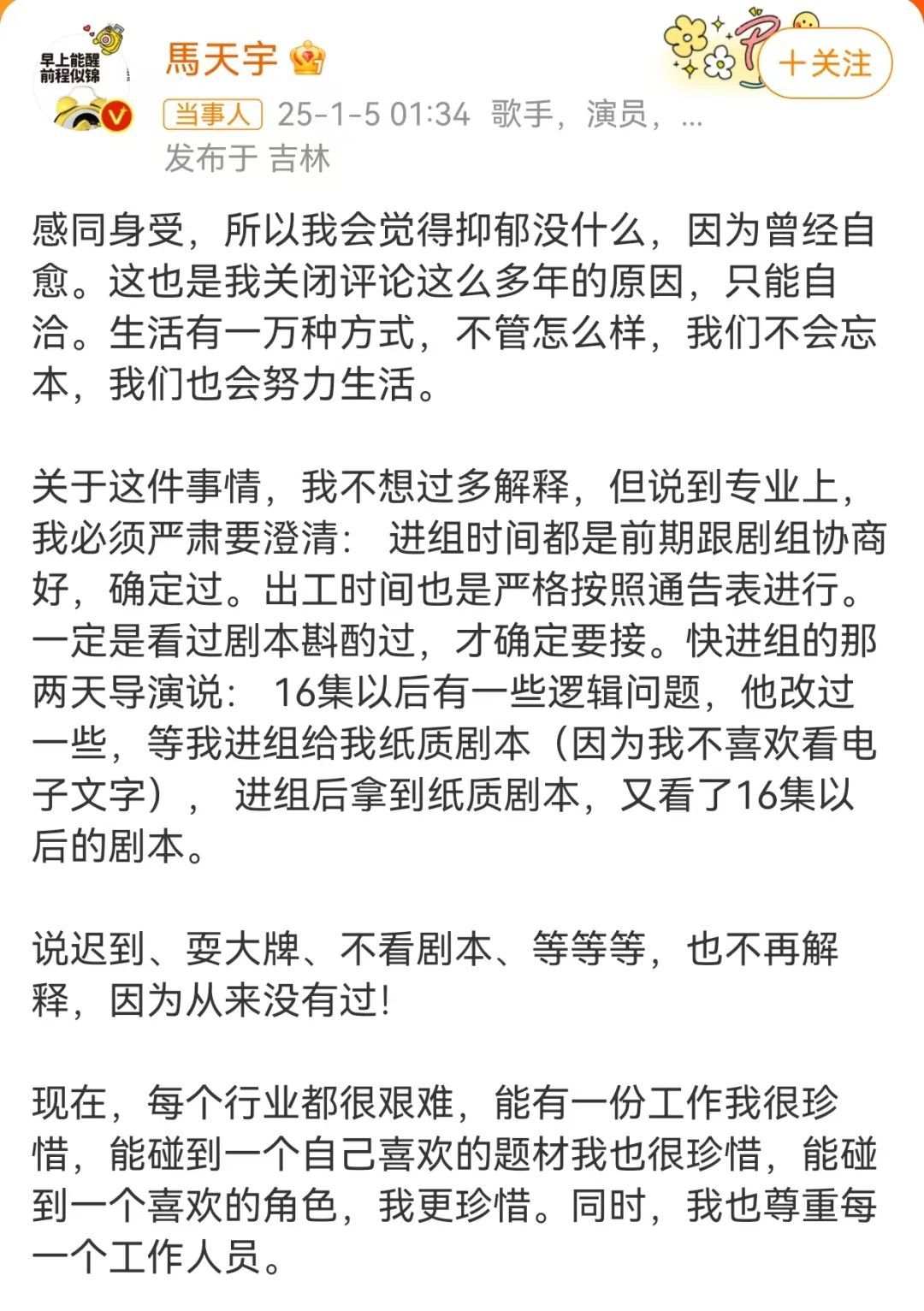 当天凌晨,马天宇发文后一度删除。之后,再次发文回应称,“说迟到、耍大牌、不看剧本等等,也不再解释,因为从来没有过!”