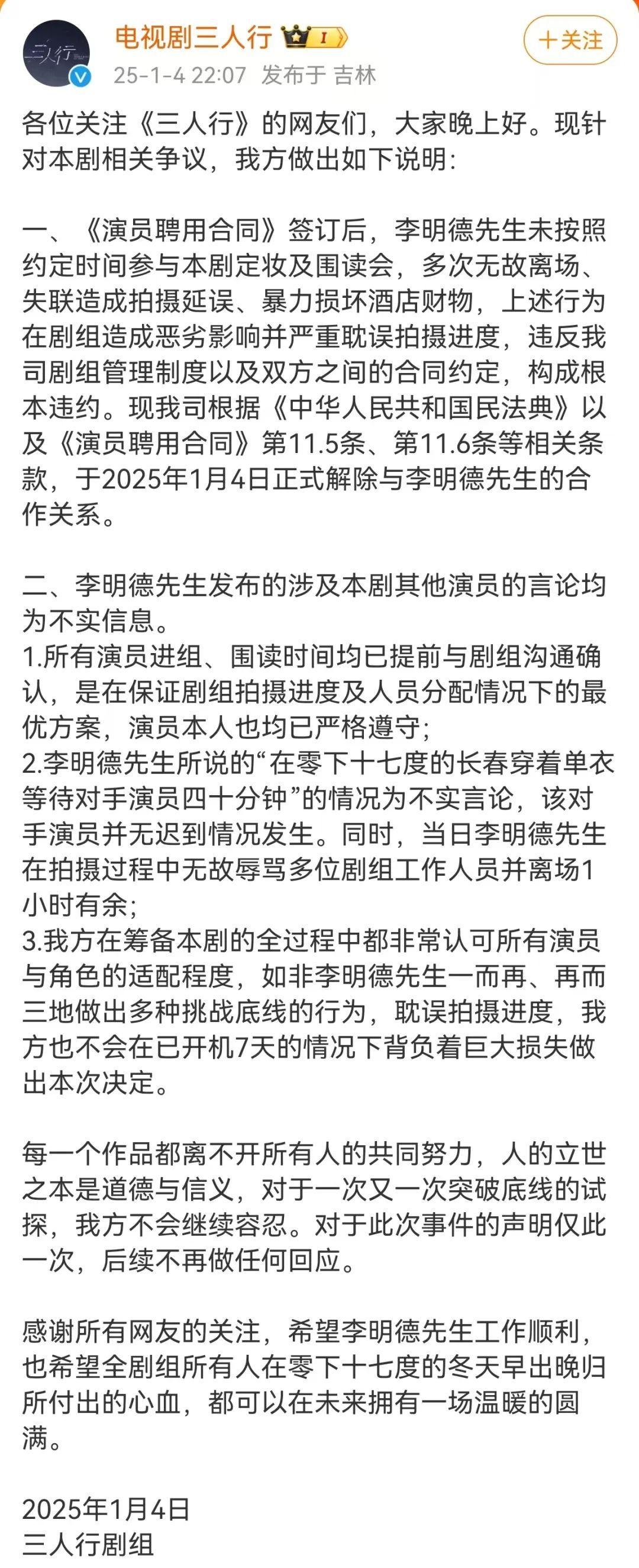 1月4日晚,《三人行》剧组发文回应。