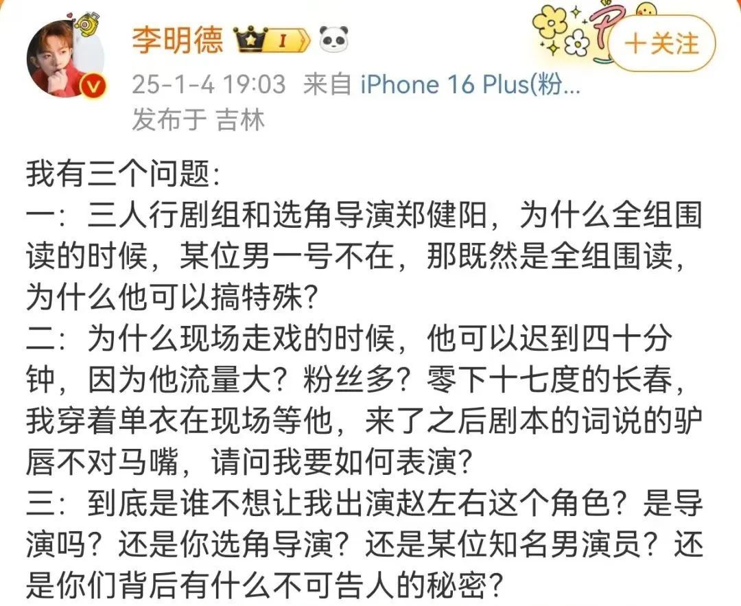 1月4日晚,男演员李明德在个人社交平台上发文,称电视剧《三人行》剧组搞区别对待,并疑似控诉男一号马天宇耍大牌。