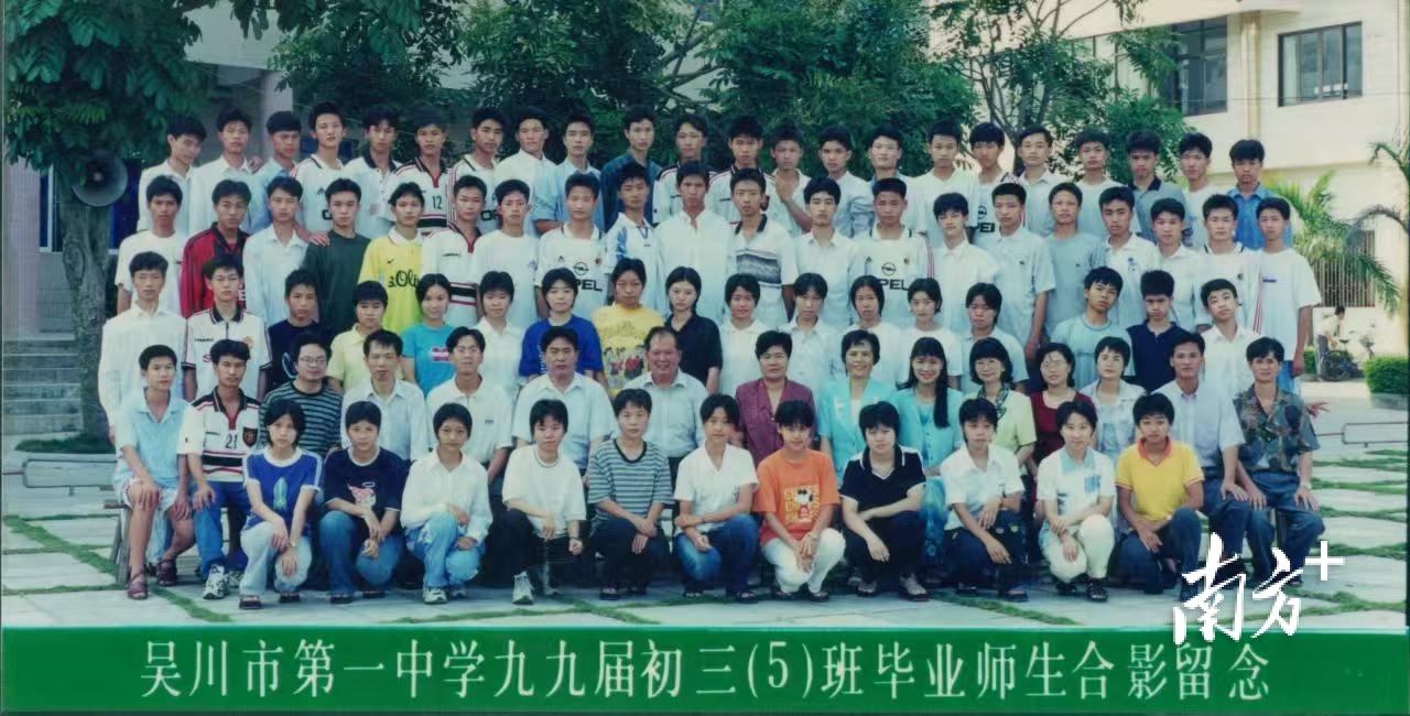在吴川一中九九届初三(五)班毕业师生合照中,梁文锋的身影赫然在列。今天,记者从梁文锋的初中班主任获悉,梁文锋是湛江市吴川市覃巴镇米历岭村人,他小学就读于吴川梅菉小学,父母都是小学语文老师。