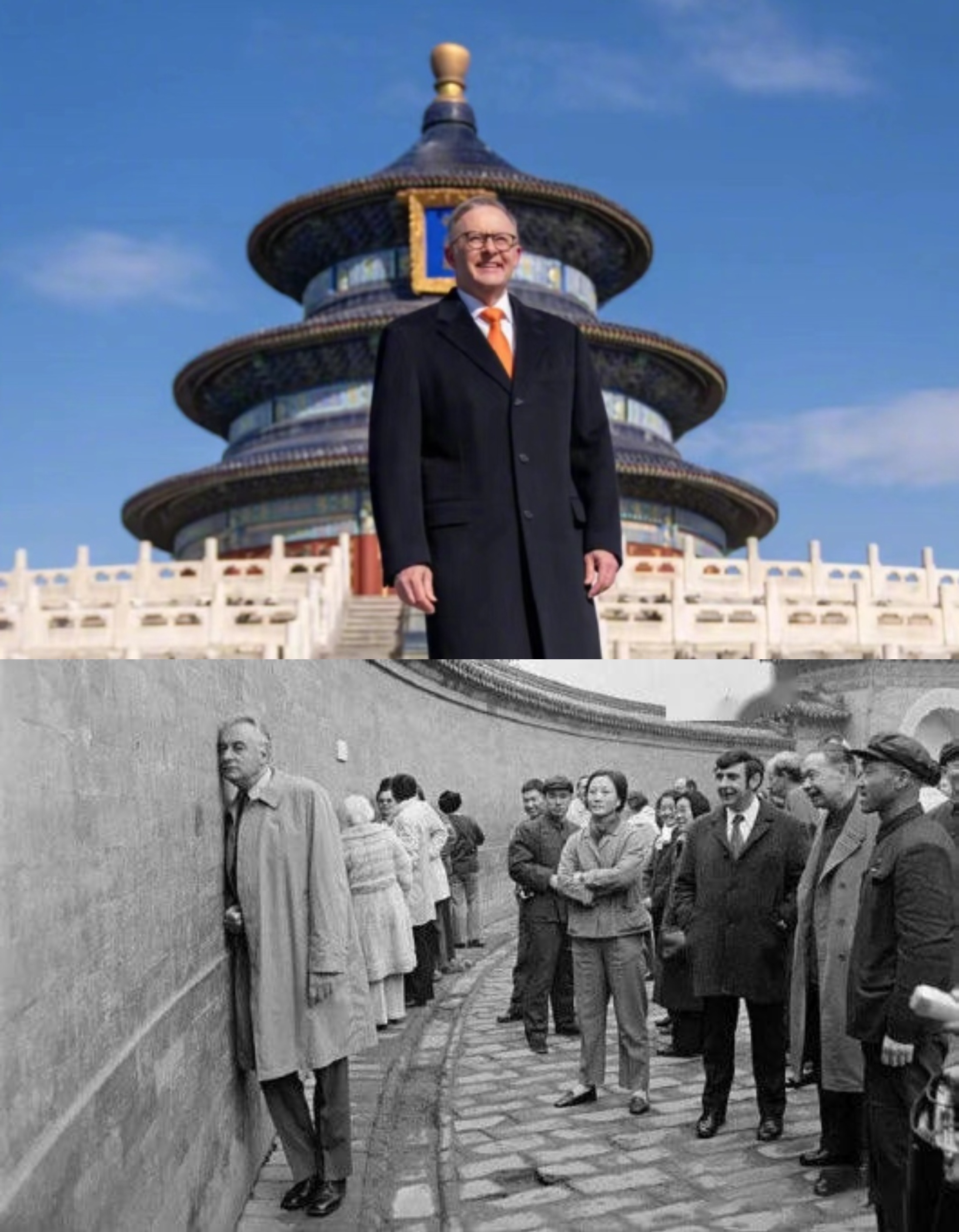 上图为澳大利亚总理阿尔巴尼斯参观北京天坛,下图为澳大利亚前总理惠特拉姆参观北京天坛的回音壁。
